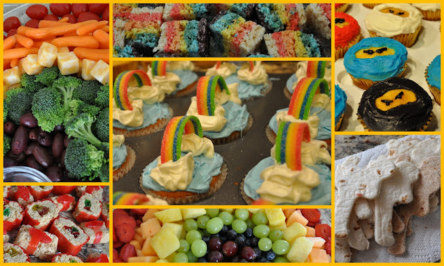After scanning the Internet and Pinterest for Ninja and Unicorn/Rainbow party theme ideas, I decided on cupcakes for both kids. Ninja mask faces for his and 3D rainbows with clouds for hers. These were my party food and decor selections:
