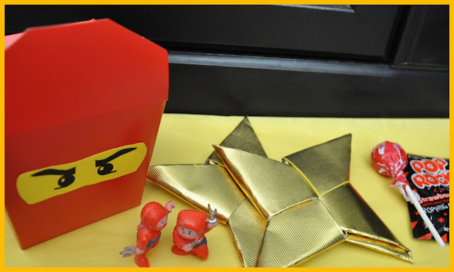 Ninjago-inspired favors: Takeout boxes with Ninjago-inspired eyes containing origami ninja stars using foil cardstock paper, ninja figurines, Pop Rocks and Tootsie Pops.